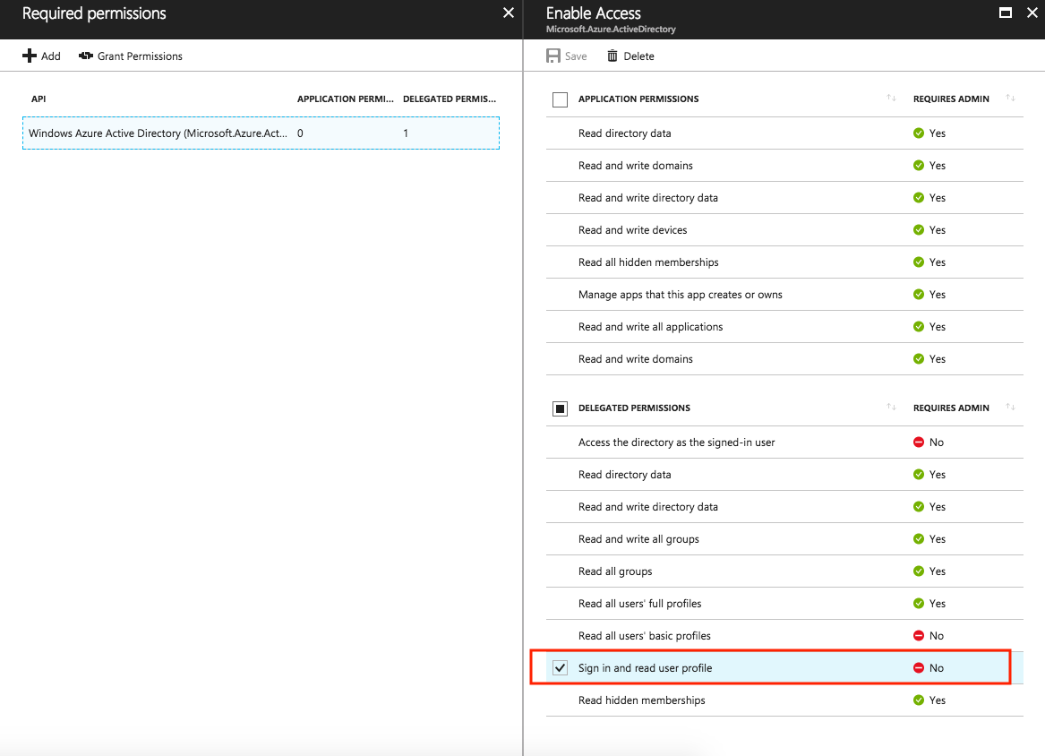 On the first step Select an API look for Windows Azure Active Directory (Microsoft.Azure.ActiveDirectory), select if and then click Select. On the second step Select Permissions select Sign in and read user profile on the Delegated Permissions section and click Select. The final configuration should look like the image below.