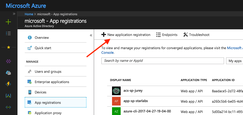 In the Azure Portal access Azure Active Directory -> App registrations and click on New application registration.