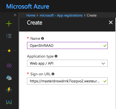 az ad app create --display-name OpenShiftAAD --homepage https://masterdnswdrnk7iozqvo2.westeurope.cloudapp.azure.com:8443/console --reply-urls https://masterdnswdrnk7iozqvo2.westeurope.cloudapp.azure.com:8443/oauth2callback/OpenShiftAAD --identifier-uris https://masterdnswdrnk7iozqvo2.westeurope.cloudapp.azure.com:8443/console --password <YOU_SUPER_AWESOME_PASSWORD>