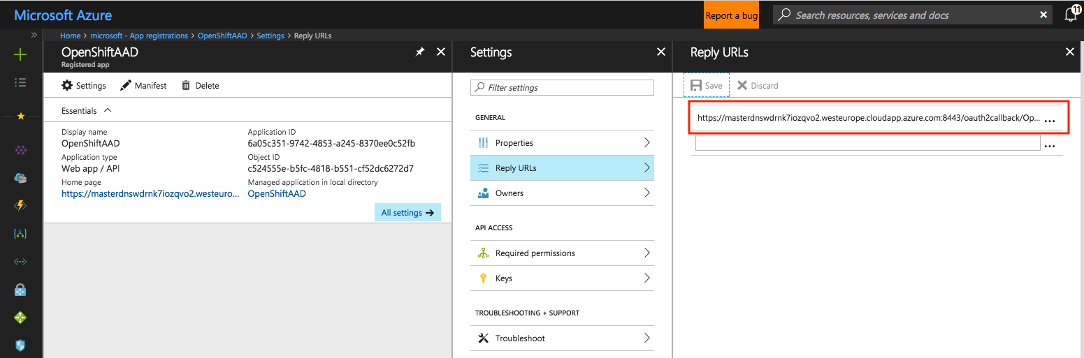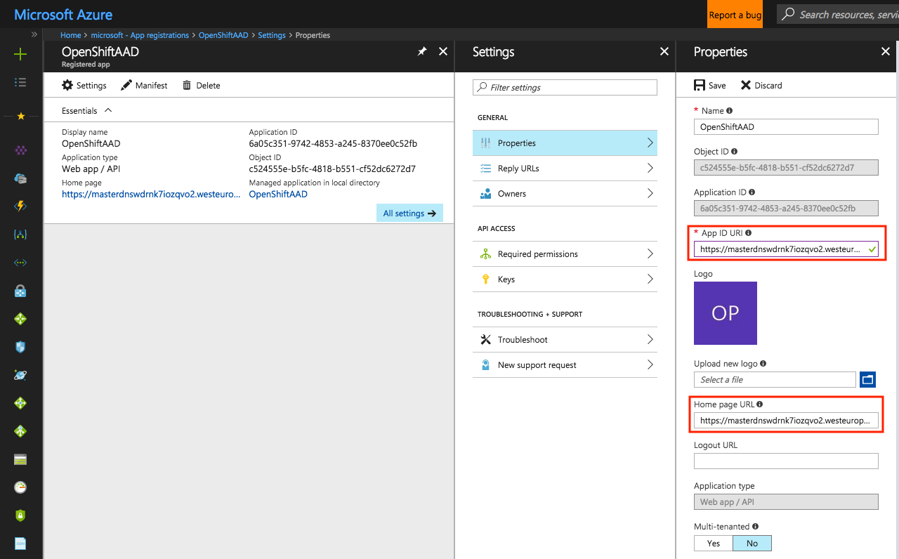 After the new app has been created open its properties and verify that the Home page URL value corresponds with the OpenShift Console URL. In this same page set the same URL as the value for the App ID URI field and save the changes.