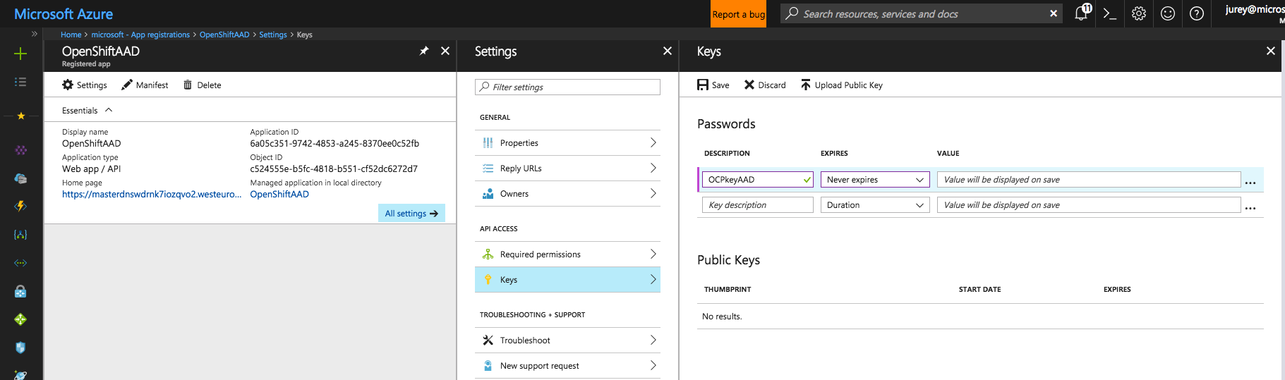 Finally go to Keys. On Passwords enter a description to identify the password, set the duration and click Save. The value of the auto-generated password will be shown on save, take not of it since we will need it later during OpenShift configuration.