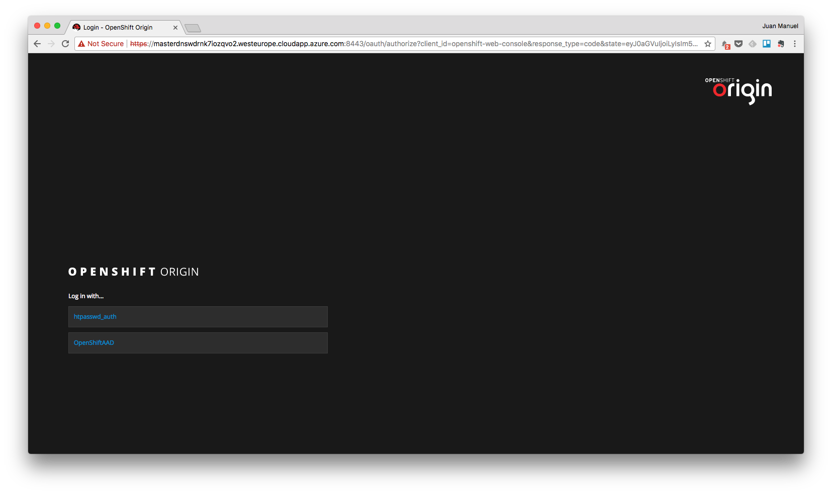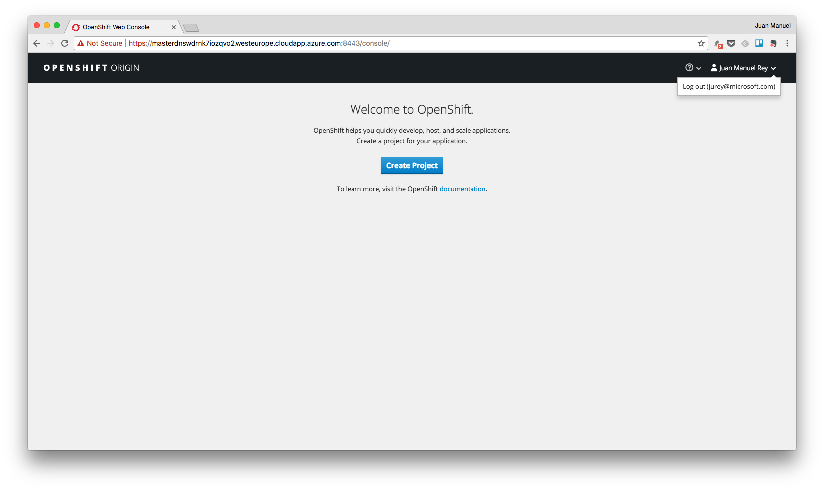 Select the second one and login using your Azure Active Directory credentials. In my case I have used my Microsoft user and you can see me logged into my OpenShift Origin lab on Azure.
