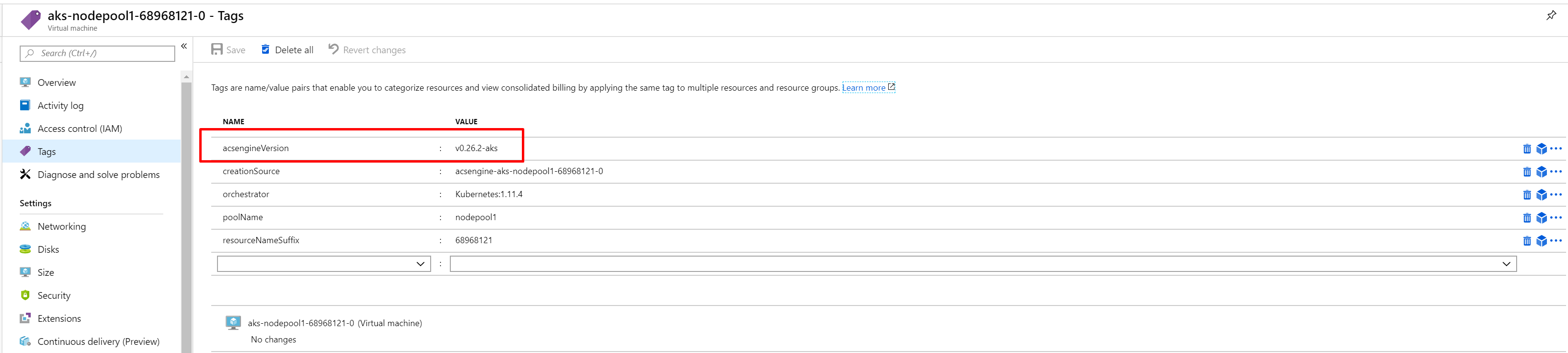All the node instances deployed in an AKS cluster has the aks-engine version used to deploy it as an Azure Tag. Let’s see an example of this using a node from one of my AKS clusters.