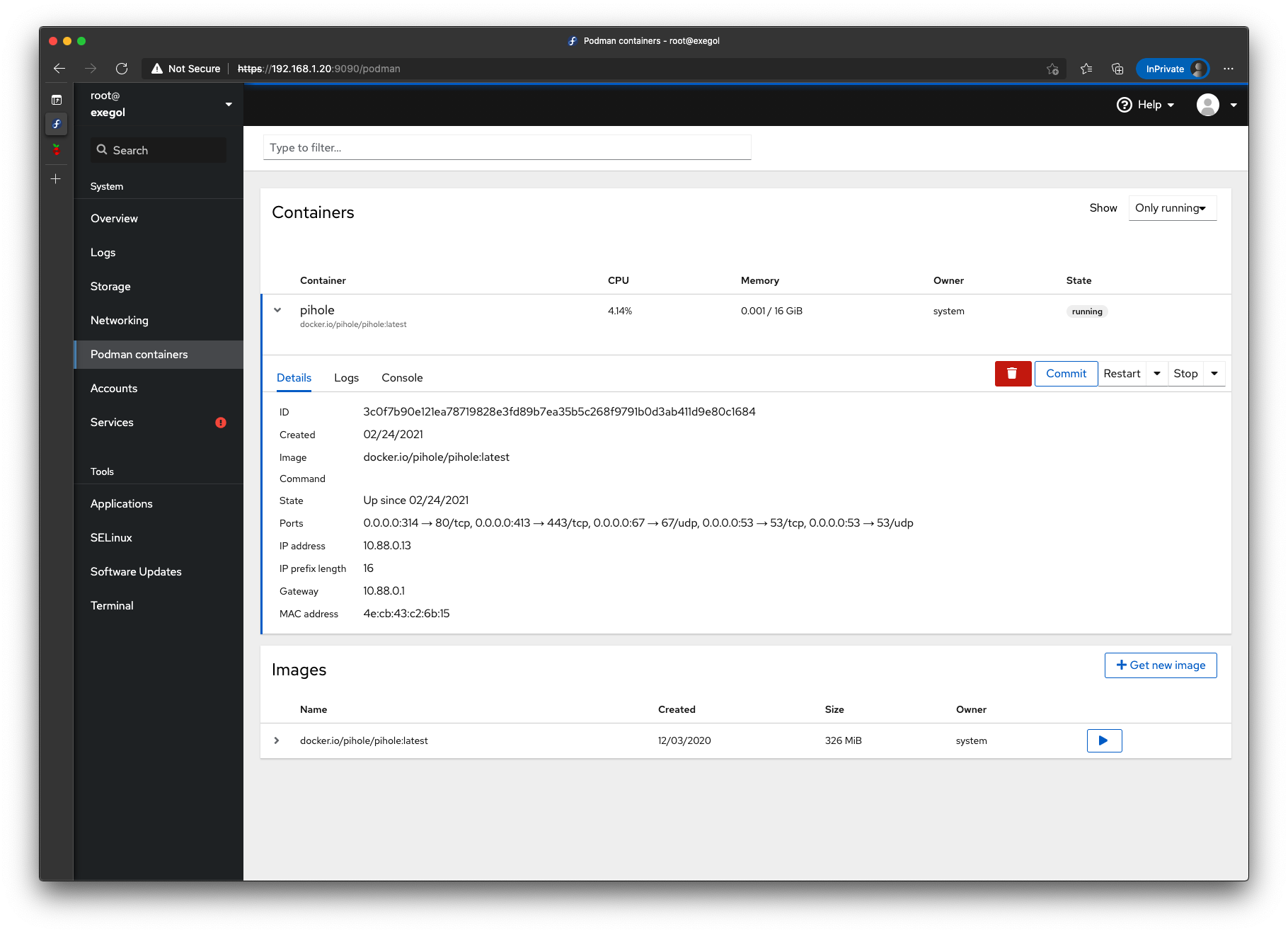 I decided to move from CentOS to Fedora Server so I installed version 33. Fedora 33 comes with a caveat, since it uses cgroupvs2 Docker does not work. But that is not the end of the world because it has Podman available instead, I’ve used it in the past for testing purposes but never to run any serious workloads at home, there are ways to install Docker in Fedora 33 but I decided to use the default option and try run Pi-Hole on it.